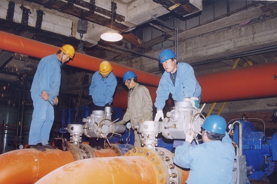 煙臺電廠——在煙臺電廠檔案室里,有一張微微泛黃的老照片,定格了1999年7月的那個火熱夏天。照片里,電廠職工們站在一米寬的供熱管道上正在進行首站循環泵出口電動門的安裝調試,這是煙臺電廠500供熱工程開工建造的場景。它不僅是山東省首個直供到戶的供熱工程,更是開啟煙臺城市溫暖篇章的“暖心工程”,500萬平方米的供熱面積,是煙臺電廠給予市民最溫暖的承諾。